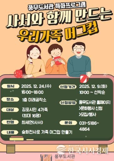 한국시사경제 경기북부취재본부 | 김포시 풍무도서관에서 연말을 맞이하여 ‘사서와 함께 만드는 우리가족 머그컵’을 오는 12월 24일 오후 4시부터 6시까지 운영한다.