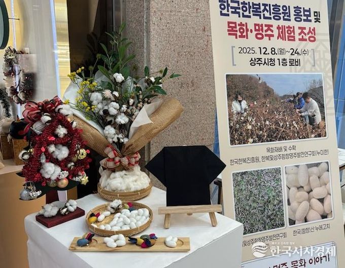 한국시사경제 경북취재본부 | 한국한복진흥원 입주기업 누미한은 12월 8일부터 12월 24일까지 진흥원 내 목화밭에서 재배한 목화솜과 명주천을 활용한 체험형 전시를 상주시청 로비에서 진행한다.