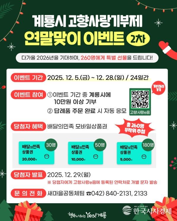 한국시사경제 김태훈 기자 | 계룡시는 연말을 맞아 고향사랑기부제 활성화를 위한 ‘연말맞이 이벤트’를 28일까지 진행한다고 밝혔다.