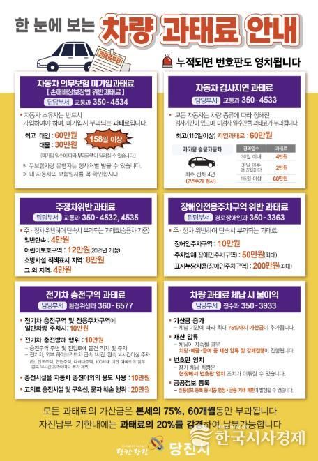 한국시사경제 충남취재본부 | 당진시는 차량 관련 과태료 정보를 한눈에 확인할 수 있는‘차량 과태료 통합 안내문’을 제작해 관내 아파트 단지와 각 행정복지센터에 비치했다고 15일 밝혔다.