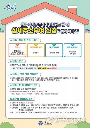 한국시사경제 대전취재본부 | 대전 유성구는 원룸과 다가구주택 주민의 주소 사용 편의를 위한 상세주소 부여 신청 서비스를 운영한다고 15일 밝혔다.
