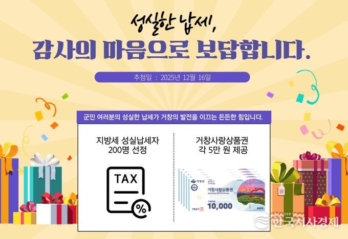 한국시사경제 경남취재본부 | 거창군은 지난 16일 지방세를 성실히 납부해 군정 재정에 기여한 군민을 예우하기 위해 ‘2025년 성실납세자 200명’을 선정했다.