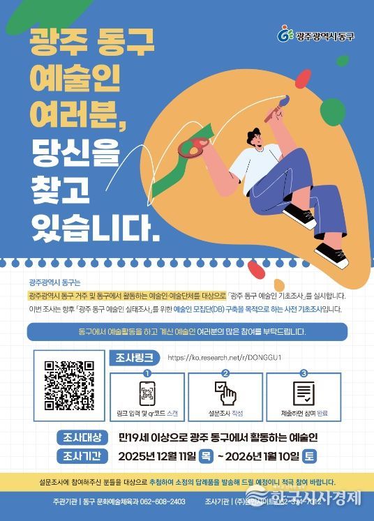 한국시사경제 광주취재본부 | 광주 동구는 내년 1월 10일까지 관내 거주하거나 활동하는 지역 예술인·예술단체를 대상으로 ‘광주 동구 예술인 기초조사’를 실시한다고 밝혔다.