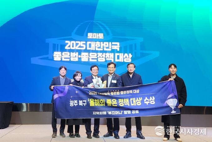 한국시사경제 광주취재본부 | 광주광역시 북구가 ‘2025년 좋은법·좋은정책 대상’ 시상식에서 지역화폐 부끄머니 발행 사례가 ‘올해의 좋은정책 대상’으로 선정됐다고 17일 밝혔다.