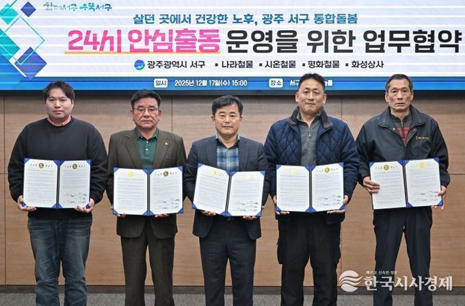 한국시사경제 광주취재본부 | 광주광역시 서구가 주민 일상 속 불편을 신속하게 해소하기 위해 팔을 걷어붙였다. 서구는 17일 서구청 나눔홀에서 관내 착한가게 4곳과 함께 ‘24시 안심출동’ 사업의 안정적 운영을 위한 업무협약을 맺고 빈틈없는 돌봄 서비스 제공에 협력하기로 했다. 이날 협약식에는 김성배 부구청장을 비롯해 윤순섭 화성상사 대표, 이영일 평화철물 대표, 주재식 나라철물 대표, 이영주 시온철물 대표가 참석했다. 이 업체들은 매월 정기 기부로 나눔을 실천하는 ‘착한가게’로 이웃돌봄 역할에도 적극적으로 참여하고 싶다는 뜻을 밝혔다.
