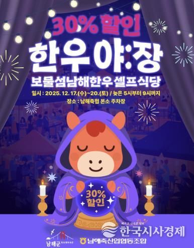 한국시사경제 경남취재본부 | 남해군은 연말을 맞아 오는 12월 17일부터 20일까지 4일간, 매일 오후 5시부터 9시까지 남해축협 본소 주차장에서 ‘한우야:장(보물섬남해한우 셀프식당)’을 운영한다고 밝혔다.