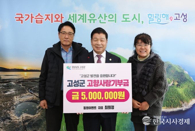 한국시사경제 윤광희 기자 | 고성군은 12월 17일, 이벤트·행사대행업체 동원이벤트의 최희정 대표가 고향사랑기부금 500만 원을 기탁했다고 밝혔다.