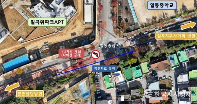 좌회전이 필요한 차량은 약 430m 앞 일곡지구입구 사거리를 이용해 우회하면 된다.