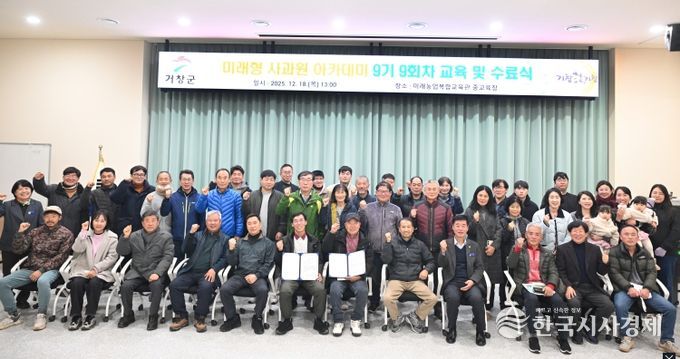 한국시사경제 경남취재본부 | 거창군은 지난 18일 농업기술센터 미래농업복합교육관 2층 중교육장에서 49명의 교육생이 참석한 가운데 ‘미래형 사과원 아카데미 9기’ 수료식을 개최했다.