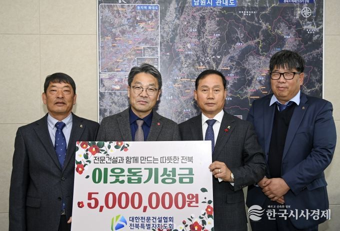 한국시사경제 전북취재본부 | 남원시는 12월 19일 대한전문건설협회 전북도회(회장 임근홍)와 남원지회(회장 김재주)가 '희망2026 나눔 캠페인'에 동참하며 500만 원의 성금을 기탁했다고 밝혔다.