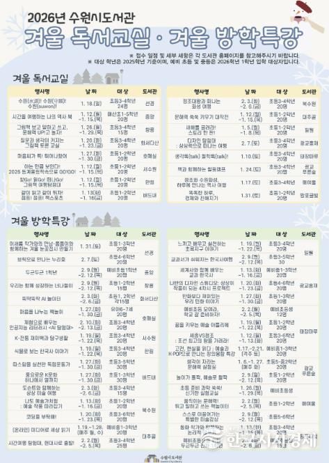수원시도서관 관계자는 “겨울방학 동안 아이들이 책과 가까워지고 다양한 경험을 쌓을 수 있도록 프로그램을 준비했다”며 “도서관이 배움과 휴식이 공존하는 공간이 되길 바란다”고 말했다.