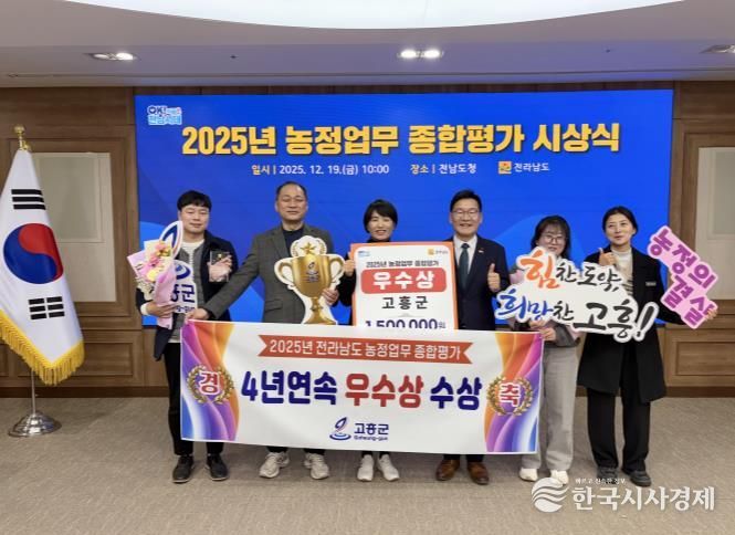 한국시사경제 전남취재본부 | 고흥군이 전라남도가 주관한 ‘2025년 농정업무 종합평가’에서 4년 연속 ‘우수상’을 수상하며, 농업 강군(强郡)으로서의 위상을 다시 한번 입증했다.