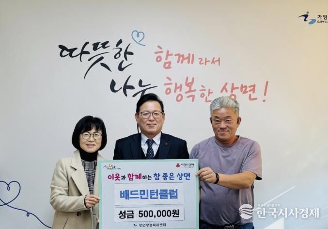한국시사경제 경기북부취재본부 | 가평군 상면 배드민턴클럽 회원 일동은 지역 내 어려운 이웃을 돕기 위해 상면 행정복지센터에 성금 50만 원을 기탁했다.