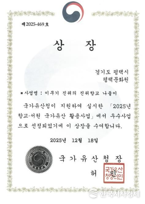 한국시사경제 사회팀 | 평택문화원은 12월 18일 대전 전통나래관 다목적강당에서 열린 국가유산청 주최 ‘2025 우리고장 국가유산 활용 우수사업 시상식’에서 평택문화원의 ‘이무기 진위의 진위향교 나들이’가 우수사업(국가유산청장상)으로 수상했다.