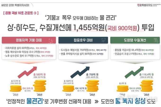 한국시사경제 권충언 기자 | 강원특별자치도는 내년도에 1,455억 원을 투입하여 가뭄 및 집중호우 등 물로 인한 기후변화와 자연재해로부터 안전한 강원자치도를 만들어 나갈 계획을 밝혔다.