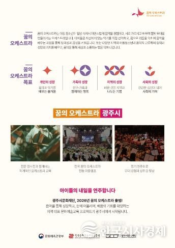 한국시사경제 이정이 기자 | (재)광주시문화재단은 문화체육관광부가 주최하고 한국문화예술교육진흥원이 주관하는 ‘2026 꿈의 오케스트라 운영사업’에서 예비 거점기관 단계를 거쳐 최종 신규 거점기관으로 선정됐다고 22일 밝혔다.
