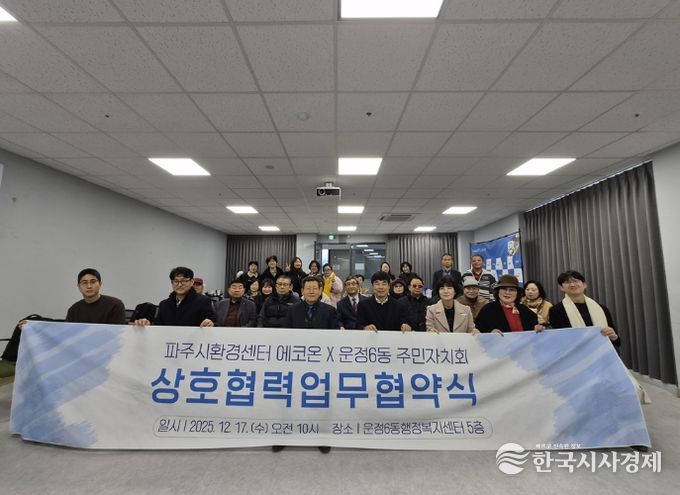 한국시사경제 경기북부취재본부 | 운정6동 주민자치회는 12월 17일 오전 10시, 운정6동 행정복지센터에서 파주시환경센터 ‘에코온’과 ‘지역 환경 의제 실천 및 기후행동 협력을 위한 업무협약’을 체결하고, 이어 마을 소식지 '초롱꽃향기로' 2호 제작 성과공유회를 개최했다.