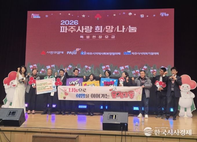 한국시사경제 경기북부취재본부 | 파주시 운정3동 주요 사회단체들은 지난 19일, 파주시민회관 대공연장에서 개최된 ‘2026 파주사랑 희망나눔 특별현장모금’에 참여해 성금과 물품을 전달하며 연말을 맞아 따뜻한 나눔을 실천했다.