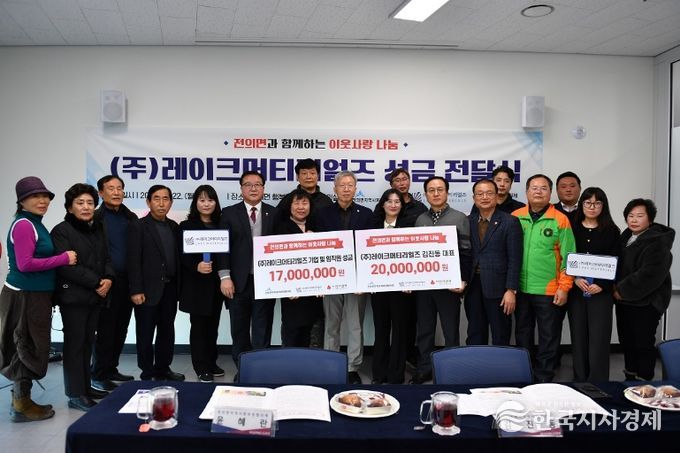 한국시사경제 세종취재분부 | 세종특별자치시 전의면지역사회보장협의체가 22일 전의면 행복누림터(복합커뮤니티센터)에서 ㈜레이크머티리얼즈로부터 성금 3,700만 원을 전달받았다.