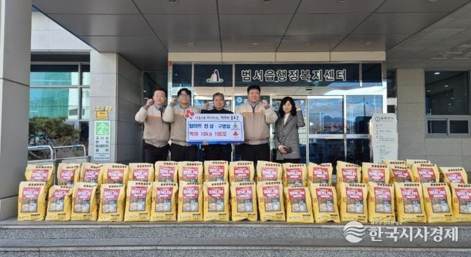 한국시사경제 울산취재본부 | 탑마트 구영점과 천상점이 22일 울주군 범서읍 행정복지센터에 지역 취약계층을 돕기 위한 백미(10㎏) 50포씩 총 100포를 전달했다.
