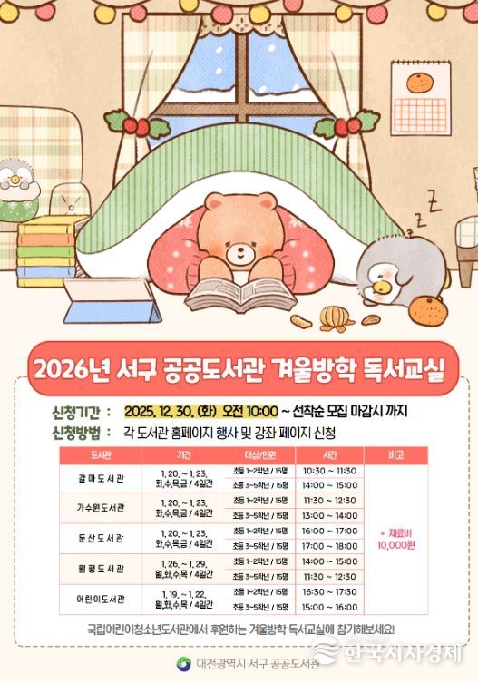 한국시사경제 대전취재본부 | 대전 서구는 겨울방학을 맞아 관내 초등학교 1~5학년 어린이를 대상으로 5개 공공도서관에서 ‘겨울방학 독서 교실’을 운영한다고 23일 전했다.