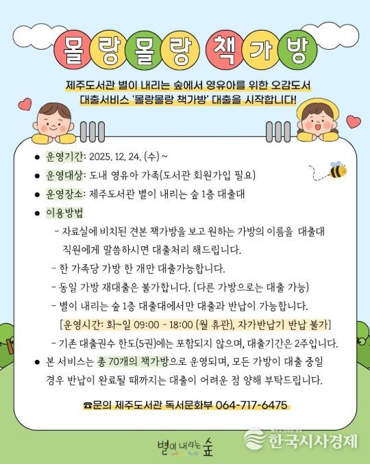 한국시사경제 노승선 기자 | 제주도교육청 제주도서관은 24일부터 영유아 오감도서 대출 서비스 ‘몰랑몰랑 책가방’을 운영한다.