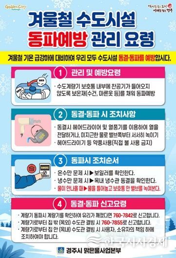 한국시사경제 경북취재본부 | 경주시는 겨울철 수도시설 동파 피해를 예방하기 위해 종합 대응대책을 수립하고 대응에 나선다고 23일 밝혔다.