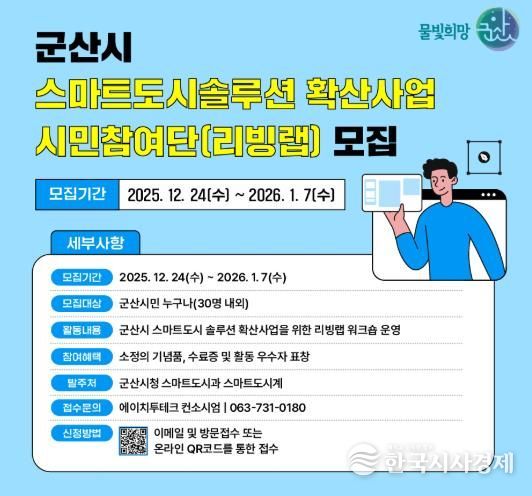 한국시사경제 전북취재본부 | 군산시가 국토교통부 주관 ‘스마트도시 솔루션 확산사업’ 추진의 하나로 시민이 직접 참여해 문제를 진단하고 개선방안을 도출하는 ‘스마트도시 솔루션 확산사업 리빙랩 시민참여단’을 2026년 1월 7일까지 모집한다.