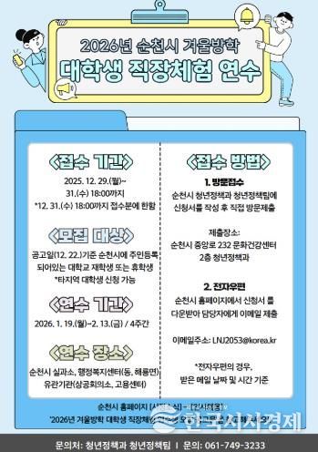 한국시사경제 전남취재본부 | 순천시는 겨울방학을 맞아 대학생들에게 행정 현장 경험의 기회를 제공하기 위해 ‘2026년 겨울방학 대학생 직장체험 연수생’을 모집한다고 밝혔다.
