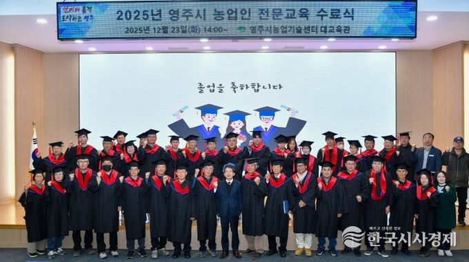 한국시사경제 경북취재본부 | 영주시는 지난 23일 농업기술센터 대교육관에서 '2025년 농업인 전문교육 수료식'을 열고, 1년간의 교육 과정을 마친 교육생 74명의 수료를 축하했다.