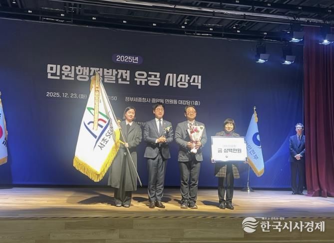 한국시사경제 이정이 기자 | 서울 서초구는 23일 정부세종청사에서 열린 행정안전부 주관 ‘2025 민원행정발전 유공 시상식’에서 오케이민원센터가 국민행복민원실 최우수기관으로 ‘대통령상’을 수상했다고 밝혔다.