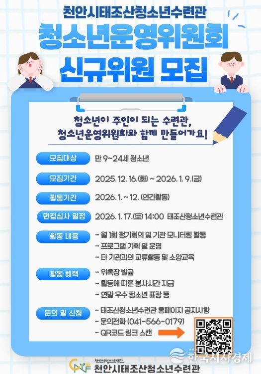 한국시사경제 충남취재본부 | (재)천안시청소년재단 천안시태조산청소년수련관은 내년 1월 9일까지 2026년 청소년운영위원회 신규 위원을 모집한다고 24일 밝혔다.