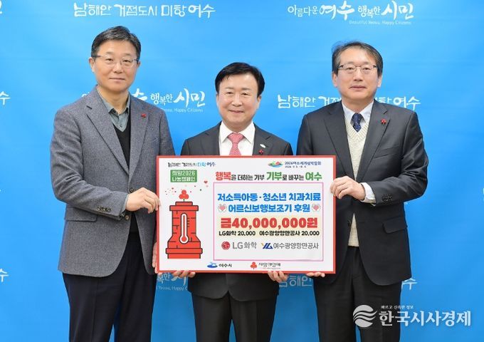 한국시사경제 전남취재본부 | 여수시는 LG화학 여수공장(주재임원 이현규)과 여수광양항만공사(사장직무대행 황학범)가 지난 23일 저소득 아동·청소년 치과치료 지원사업과 노인 보행 보조기 지원사업 추진을 위해 2천만 원씩 총 4천만 원을 후원하는 증서를 전달했다고 밝혔다.