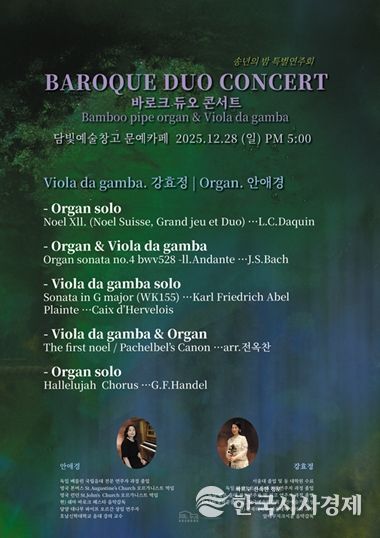 한국시사경제 이정이 기자 | 담양군문화재단은 오는 28일 오후 5시 담빛예술창고 문예카페에서 『2025 담빛예술창고 송년특별연주회 ‘바로크 듀오 콘서트’』를 진행한다고 밝혔다.