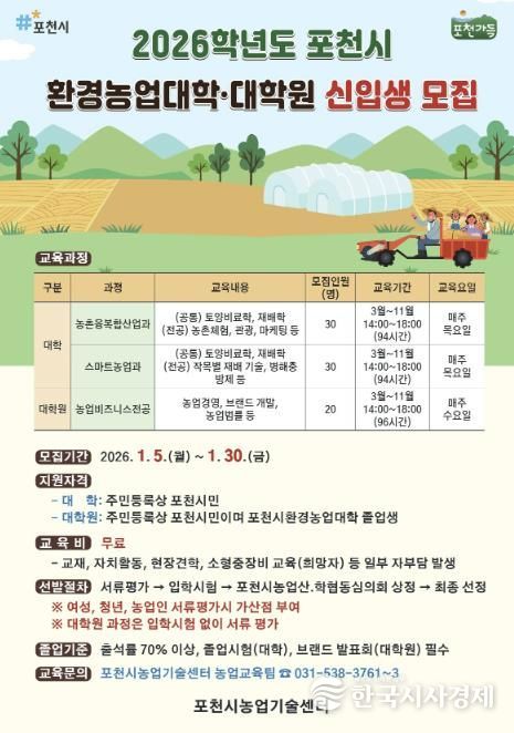 한국시사경제 경기북부취재본부 | 포천시는 2026년 1월 5일부터 30일까지 ‘2026학년도 포천시 환경농업대학 및 대학원’ 신입생을 모집한다.