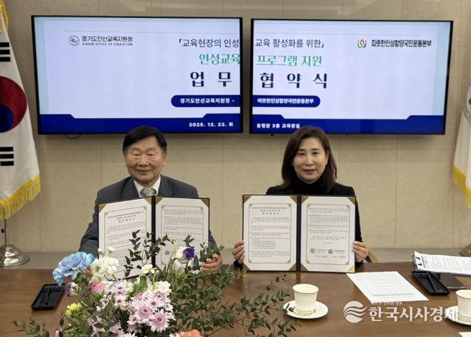 한국시사경제 문화팀 | 경기도안산교육지원청은 12월 23일 오후 3시 30분, 따뜻한인성함양국민운동본부와 학교 현장의 인성교육 강화와 도덕성 회복을 위한 지역 연계형 인성교육 지원 체계 구축을 위한 업무협약(MOU)을 체결했다.