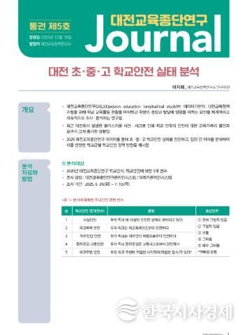 한국시사경제 대전취재본부 | 대전교육과학연구원 대전교육정책연구소는 2025년 대전교육종단연구저널 제5호'대전 초·중·고 학교안전 실태 분석', 제6호 '대전 교육가족의 정신건강 현황 분석'을 발간하여 대전 모든 기관 및 전국 교육정책연구소에 안내하고, 대전교육과학연구원 누리집에 공개했다고 밝혔다.
