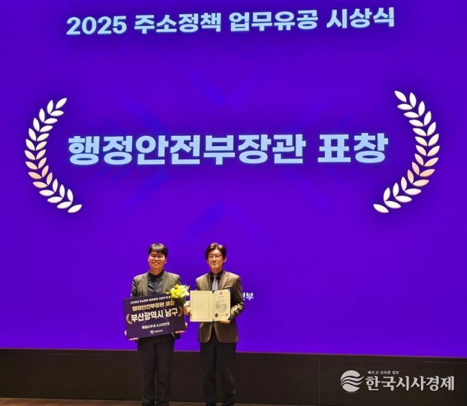 한국시사경제 부산취재본부 | 부산광역시 남구는 행정안전부가 주관한 ‘2025년 주소정책 업무 유공’ 분야에서 우수 기관으로 선정돼 행정안전부 장관 표창을 수상하고, 특별교부세 4천만 원을 확보했다고 밝혔다.