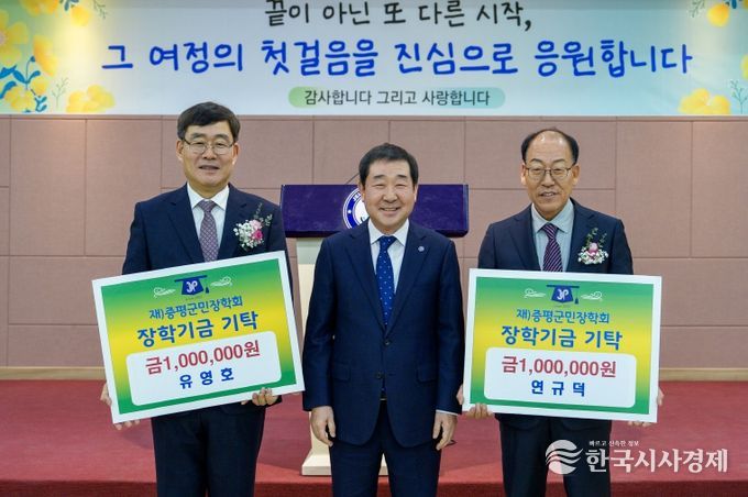 한국시사경제 충북취재본부 | 충북 증평군은 26일 군청 대회의실에서 열린 2025년 하반기 공로연수 이임식에서 유영호 행정복지국장과 연규덕 축산산림과장이 (재)증평군민장학회(이사장 이재영 증평군수)에 각각 장학금 100만 원을 기탁했다고 밝혔다.