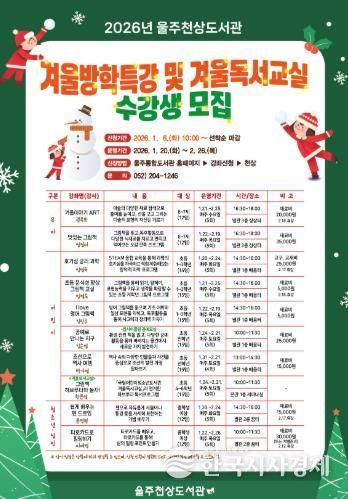 한국시사경제 울산취재본부 | 울주천상도서관이 다음달 20일부터 내년 2월 26일까지 겨울방학을 맞아 겨울방학특강 및 겨울독서교실을 운영한다고 30일 밝혔다.