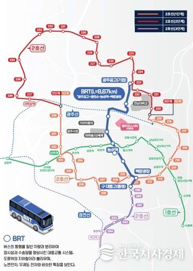 한국시사경제 광주취재본부 | 광주시가 대규모 도시개발로 교통 혼잡이 예상되는 광천권역에 도입하는 ‘백운~매곡 간선급행버스체계(BRT)’ 구축 사업을 올해 본격 추진한다.