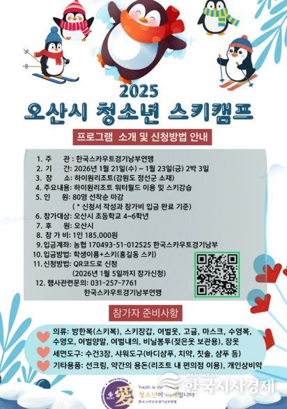 이권재 오산시장은 “이번 겨울 스키캠프는 청소년들이 자연 속에서 다양한 체험활동을 통해 협동심과 도전정신을 기를 수 있는 소중한 기회가 될 것”이라며, “앞으로도 청소년의 건강한 성장과 건전한 여가활동을 지원하는 체험형 프로그램을 지속적으로 확대해 나가겠다”고 말했다.