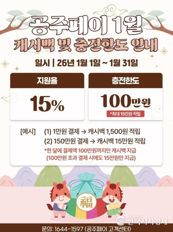 이에 따라 충전 시기와 관계없이 월 100만 원 한도 내에서 공주페이로 결제한 금액의 15%가 환급금으로 제공된다. 이용자는 한 달에 최대 15만 원까지 혜택을 받을 수 있다.
