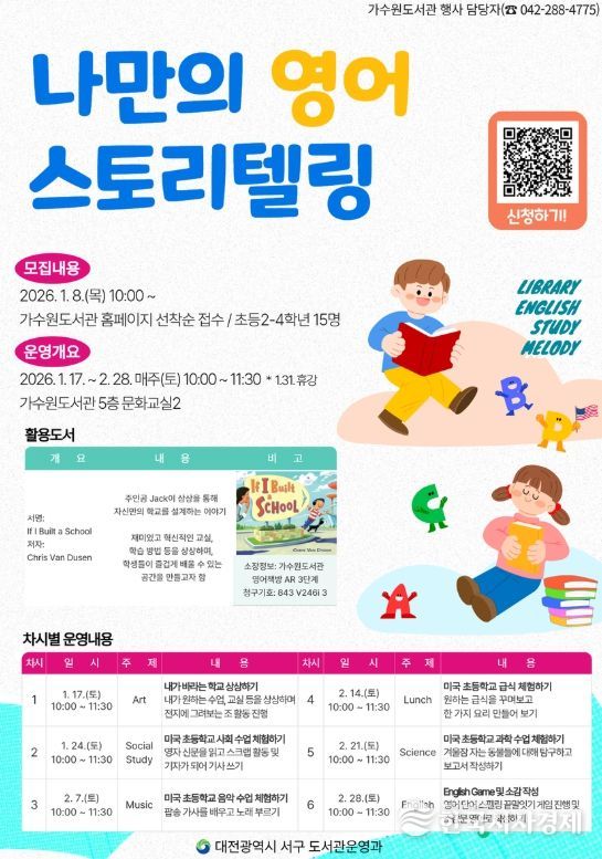 한국시사경제 대전취재본부 | 대전 서구 가수원도서관은 초등학생 영어 원서 읽기 프로그램 ‘나만의 영어 스토리텔링’을 이달 17일부터 다음 달 28일까지 운영한다.