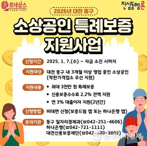 한국시사경제 대전취재본부 | 대전 동구는 경기 침체와 고금리 기조로 경영에 어려움을 겪고 있는 지역 소상공인을 지원하기 위해 ‘2026년 소상공인 특례보증 지원사업(진심동행론)’을 본격 시행한다고 6일 밝혔다.
