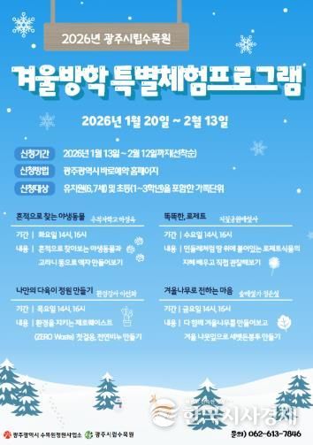 한국시사경제 광주취재본부 | 광주광역시 시립수목원은 어린이를 위한 ‘2026년 겨울방학 체험 프로그램’ 참가자 640명을 오는 13일 오전 10시부터 선착순 모집한다.