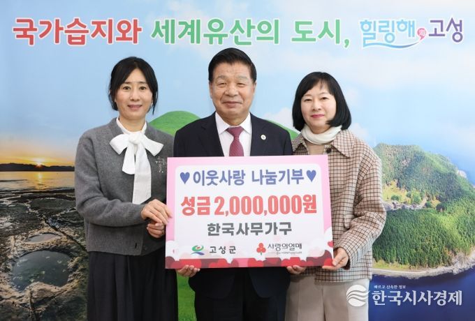 한국시사경제 윤광희 기자 | 고성군 대독리 소재 한국사무가구 김현주 부사장은 1월 6일, 고성군청을 방문하여 관내 어려운 이웃을 위해 써 달라며 이웃돕기성금 200만 원을 전달했다.