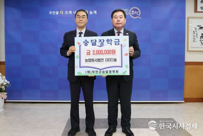 한국시사경제 권충현 기자 | 무안군은 지난 9일 농업회사법인 유한회사 다솔 김지수 대표가 지역 인재 육성을 위해 (재)무안군승달장학회에 장학금 200만 원을 기탁했다고 밝혔다.