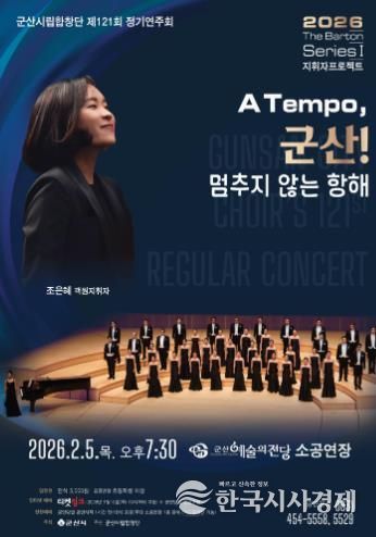한국시사경제 윤경수 기자 | 군산시립합창단이 제121회 정기연주회 〈2026 The Barton Series Ⅰ 지휘자 프로젝트〉 A Tempo, 군산! '멈추지 않는 항해'를 오는 2월 5일 저녁 7시 30분, 군산예술의전당 소공연장에서 개최한다.
