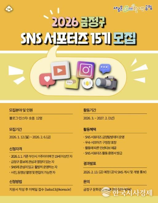 금정구는 오는 2월 6일까지 3개 분야(블로그, 인스타, 숏폼) SNS 서포터즈를 선발할 계획이라고 밝혔다.